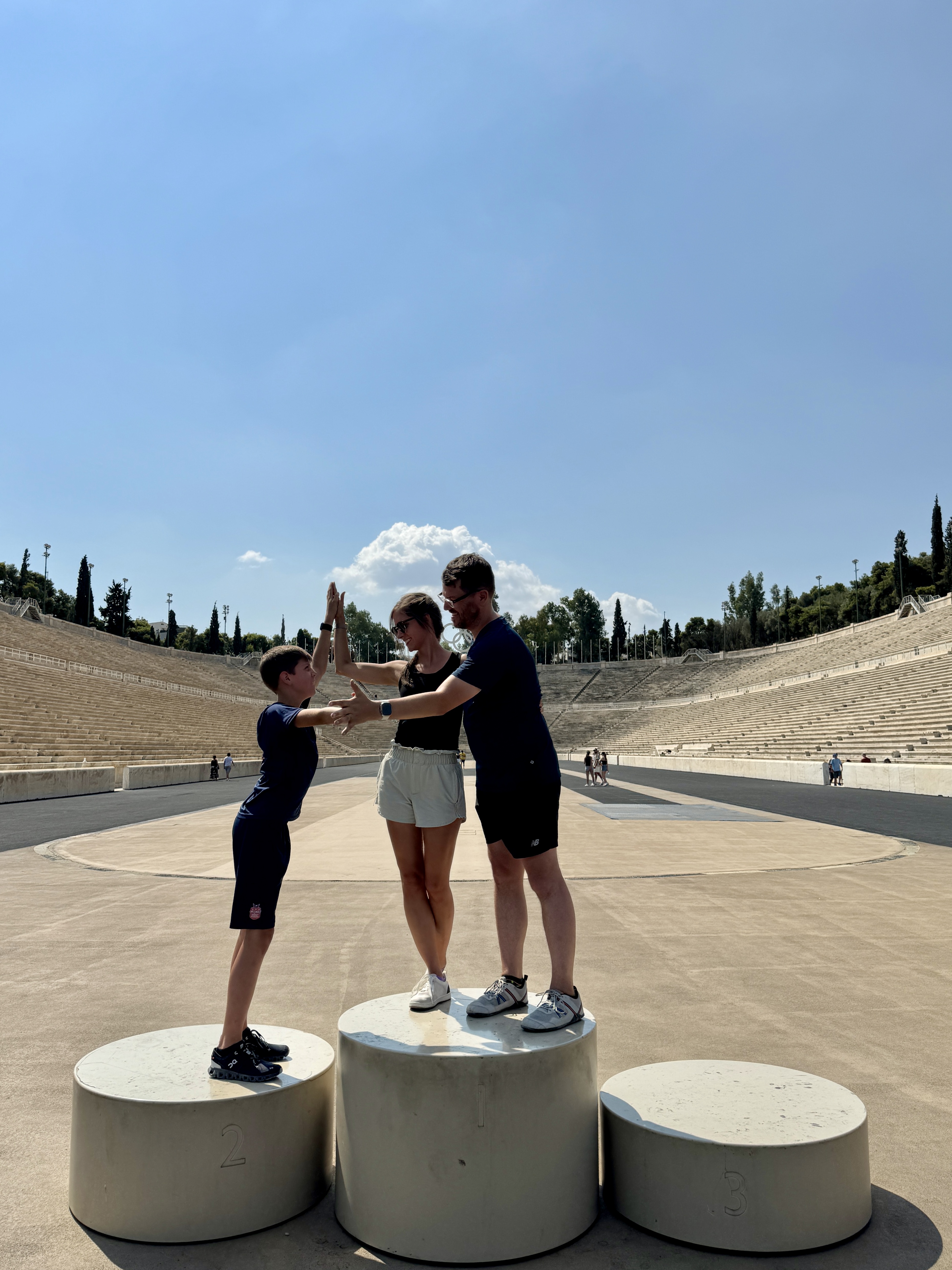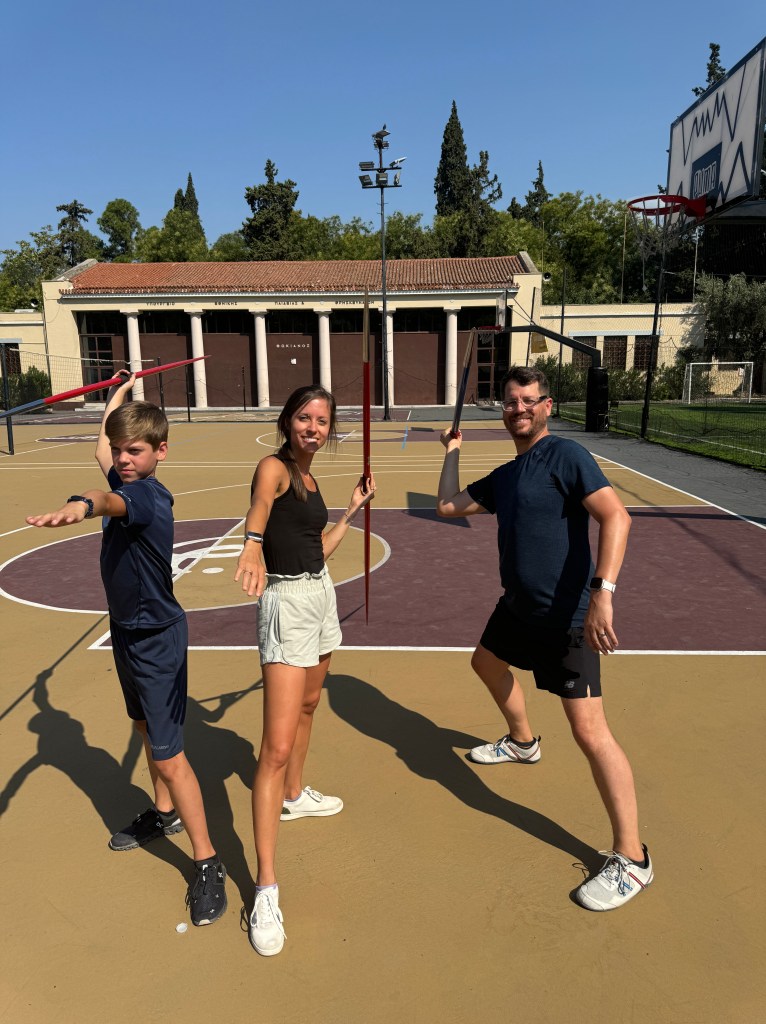 - We then moved to a nearby gymnasium, one of the first in Greece. Here we learned proper technique for different original Olympic sports: javelin, long jump, and shot put. Evi interwove facts about the Olympics along the way. It’s the Olympics, so of course we had to keep track the winners of each event. Luckily there were men’s, women’s, and kid’s categories, so we all came out on top. Also worth noting, we used very modified equipment for safety, but we got to hold and feel the weight of the real tools as well.