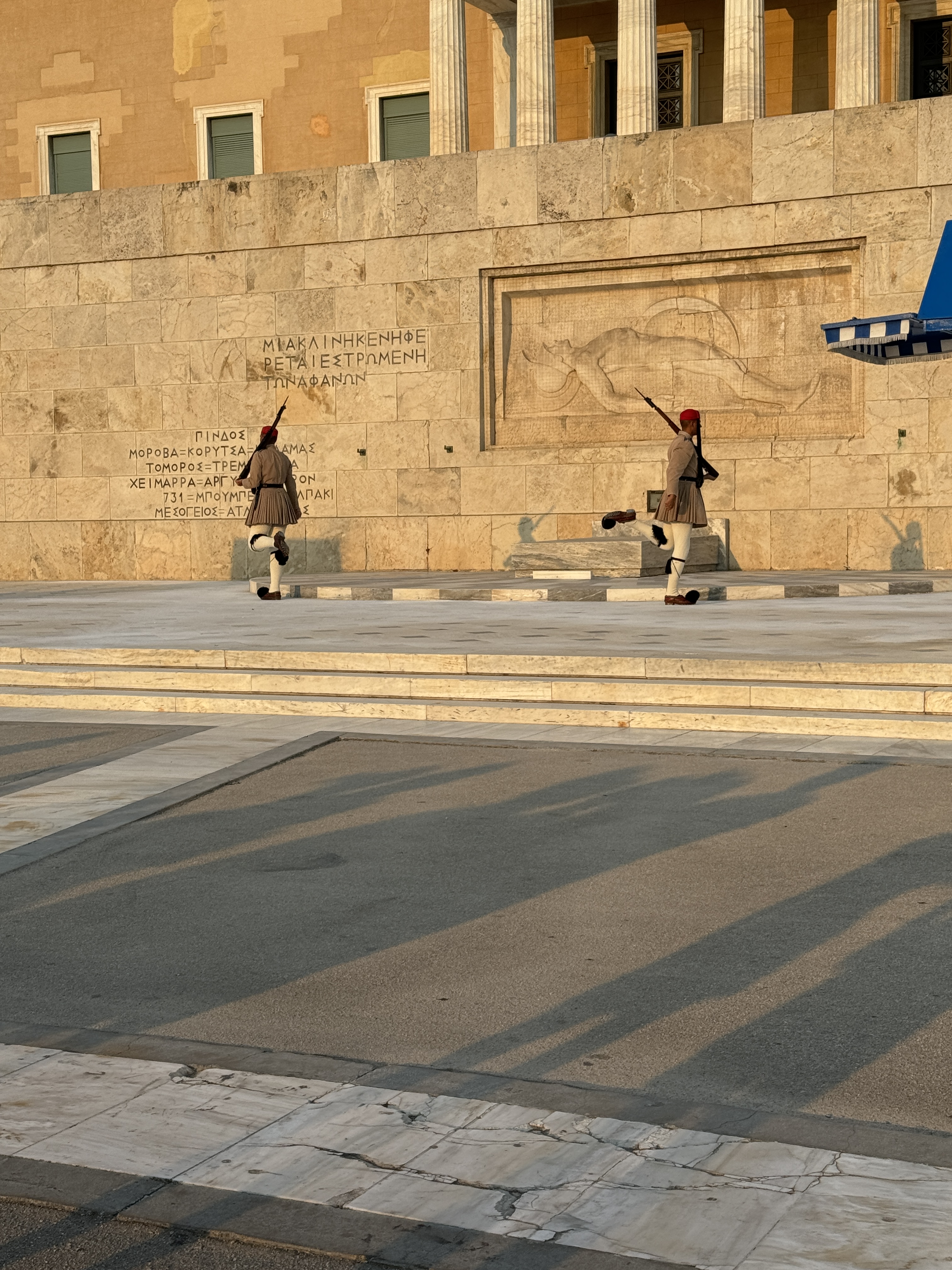 - After spending the afternoon resting in the Airbnb and waiting for the heat to die down a bit. we heading to Syntagma Square. We watched the guards ‘march’ at the tomb of the unknown soldier. I say ‘march’ because it was truthfully more like rhythmic, choreographed movements completely in sync. They even had taps of sorts on their shoes to increase the sound.