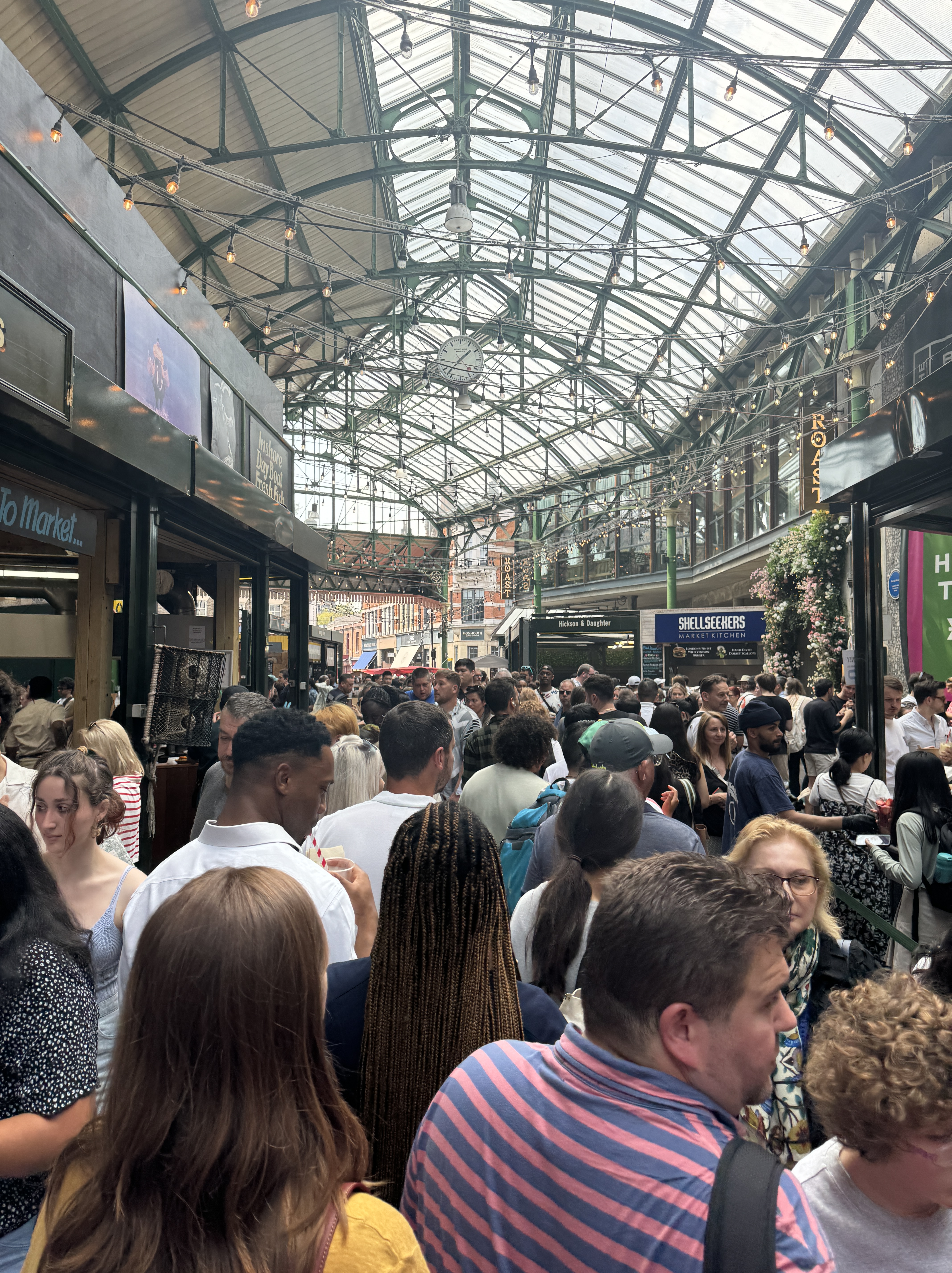 - After our tour and a small rest, we ventured out for lunch. We are staying in Southwark area and had walked by Borough Market a few times. Upon research, it seemed like a grander Union Market and there were a handful of vegan vendors. We walked over and were instantly inundated with people. As in, we can only move in one direction because there are so many people. Truthfully I’m not sure how anyone was shopping in there. Our new goal was just to escape.