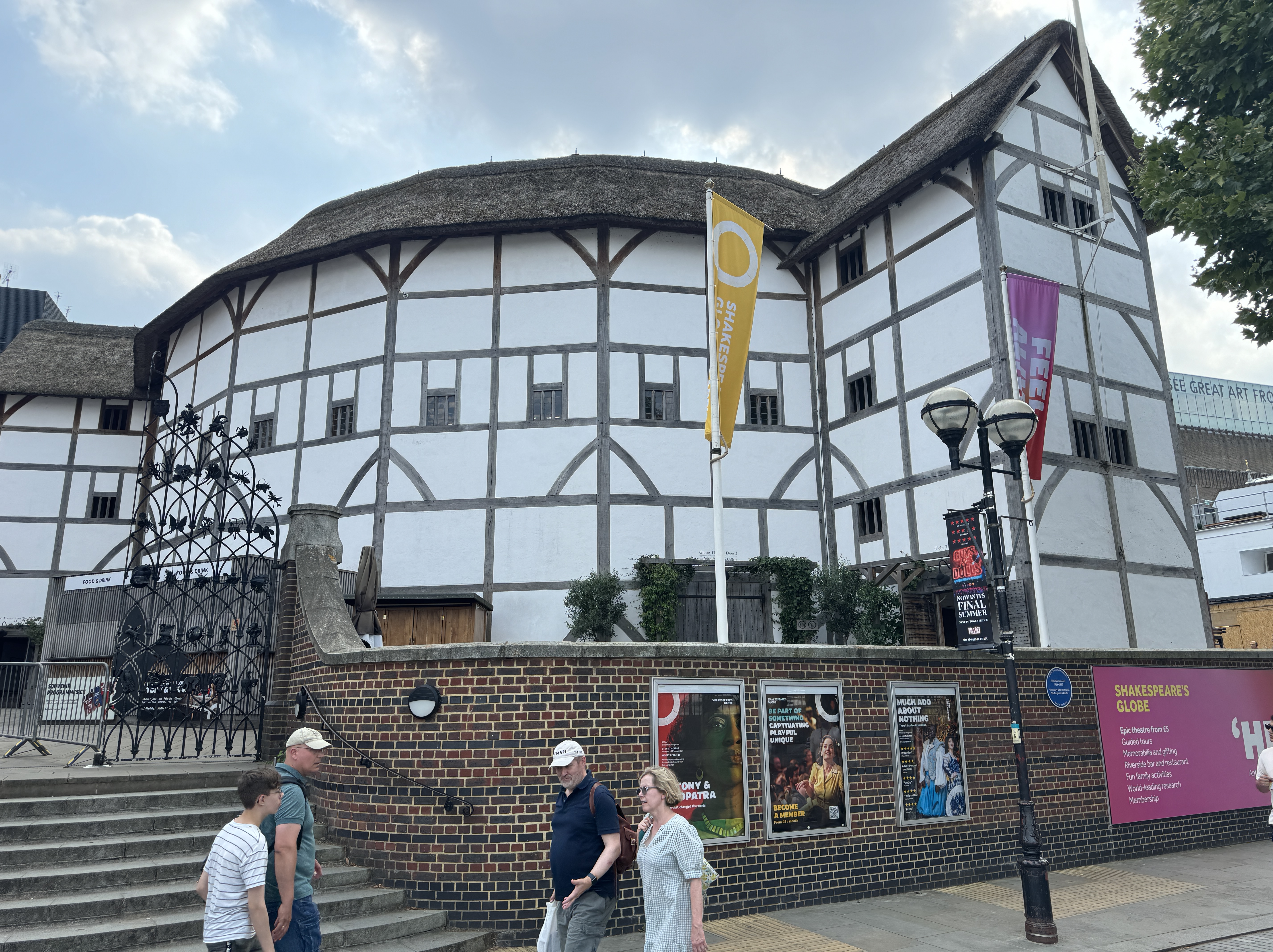 - We spent a bit of our afternoon touring the sites close to our hotel. We walked by The Globe Theater. It is the only building in the city that has approval to be all wood with a thatched roof (with a lot of fire safety systems installed). We also walked on the Millennium Bridge (seen being destroyed by Death Eaters in Harry Potter 6).