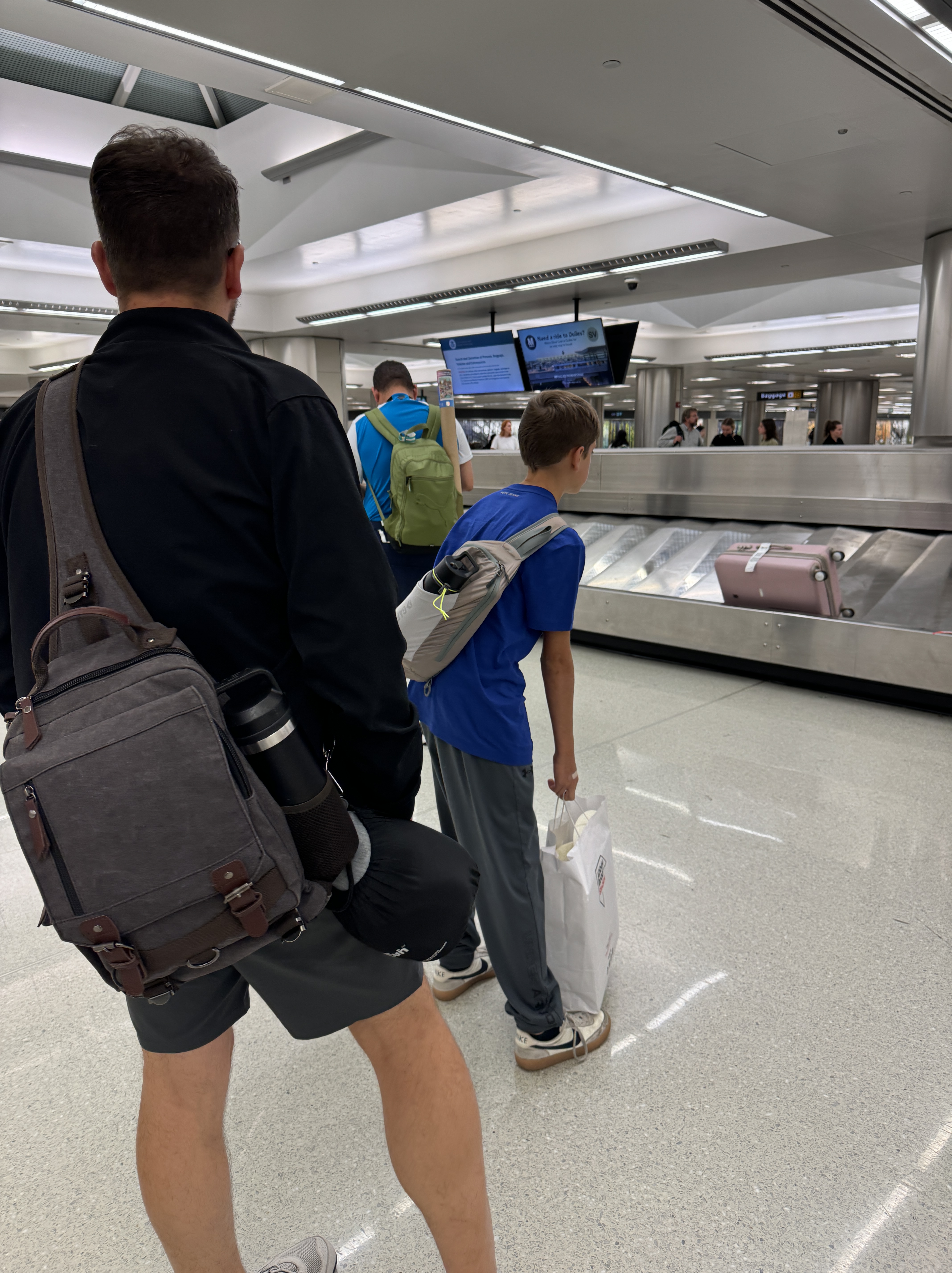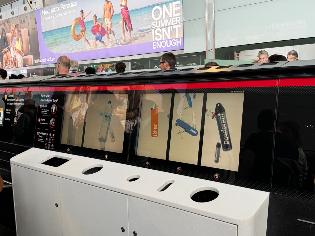 - Of course this time it didn’t take long to get through the line. Ya just never know! The security line was interesting. There was a huge area for disposing of items you can’t have on planes. Good thing Liam’s new Swiss arm knife was in his checked bag!