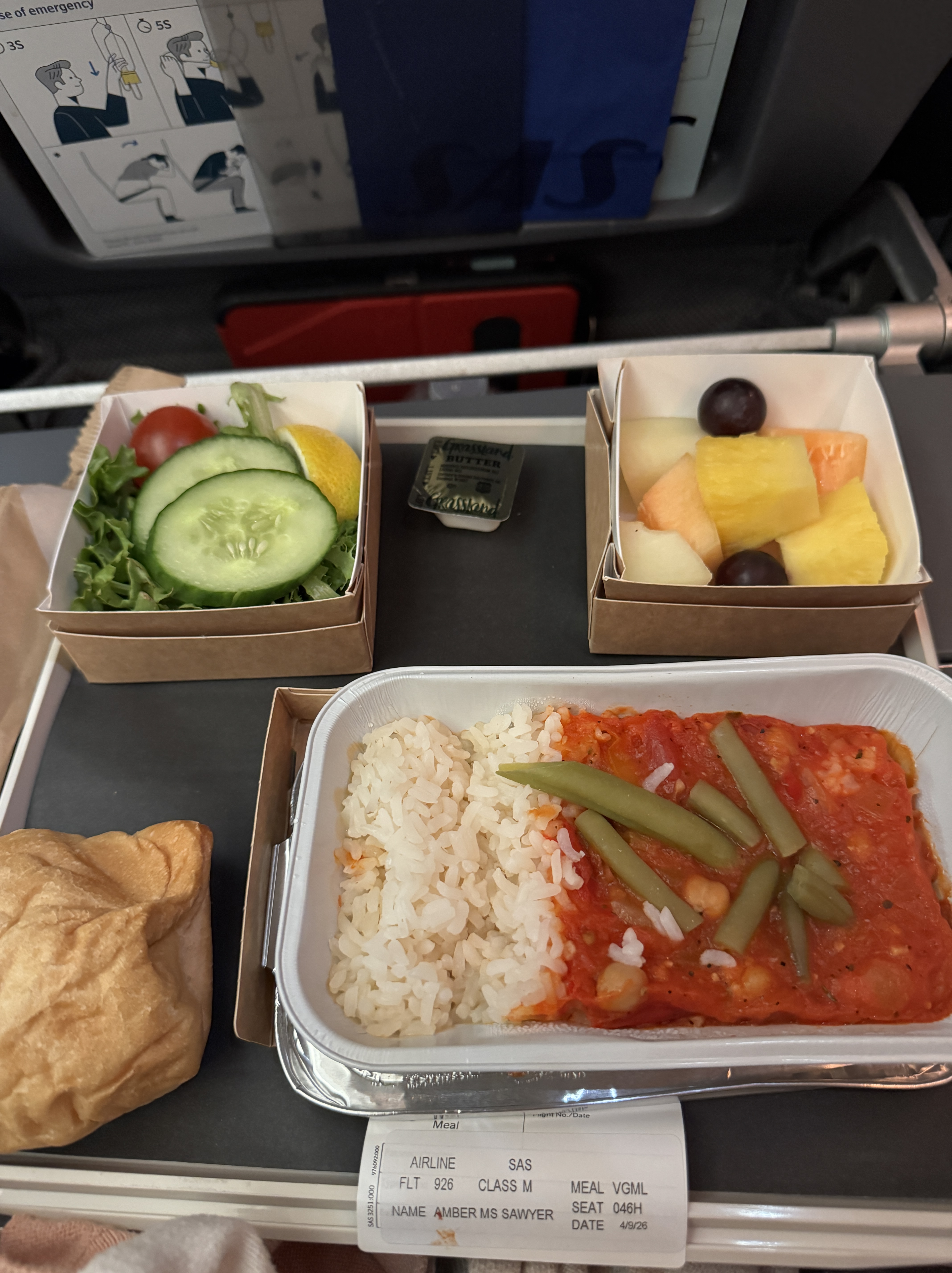When the time came, we headed to our plane and got punched in the face by stagnant, warm air. The plane was toasty, y’all. We stripped off layers and crossed our fingers air movement would accompany takeoff (which it did). We had big aspirations of falling asleep immediately to maximize the overnight flight toward jet lag. The flight attendants had other ideas. Many rounds of serving drinks and food led to hours of bright plane lights (thankful for a vegan meal option though!).