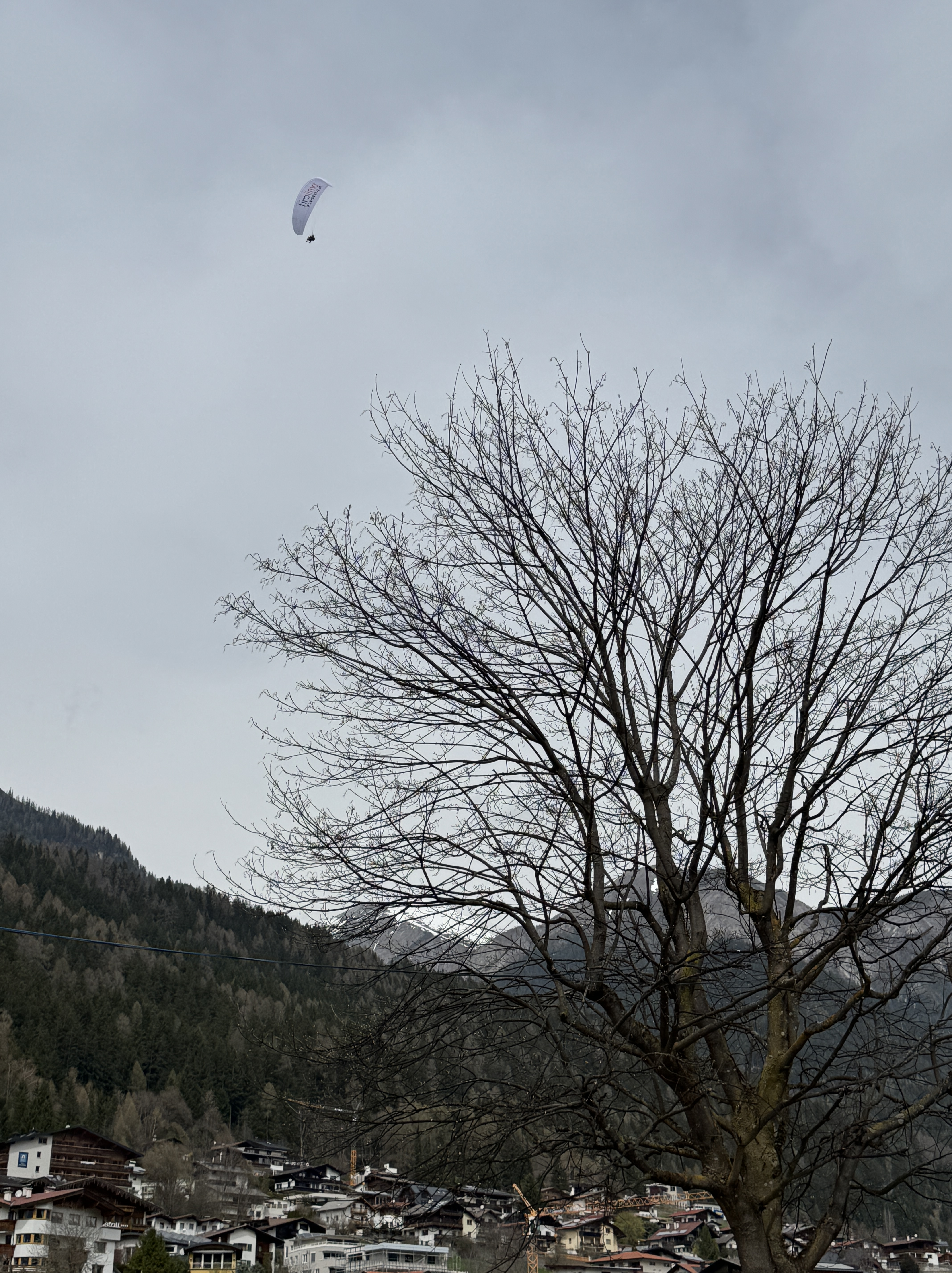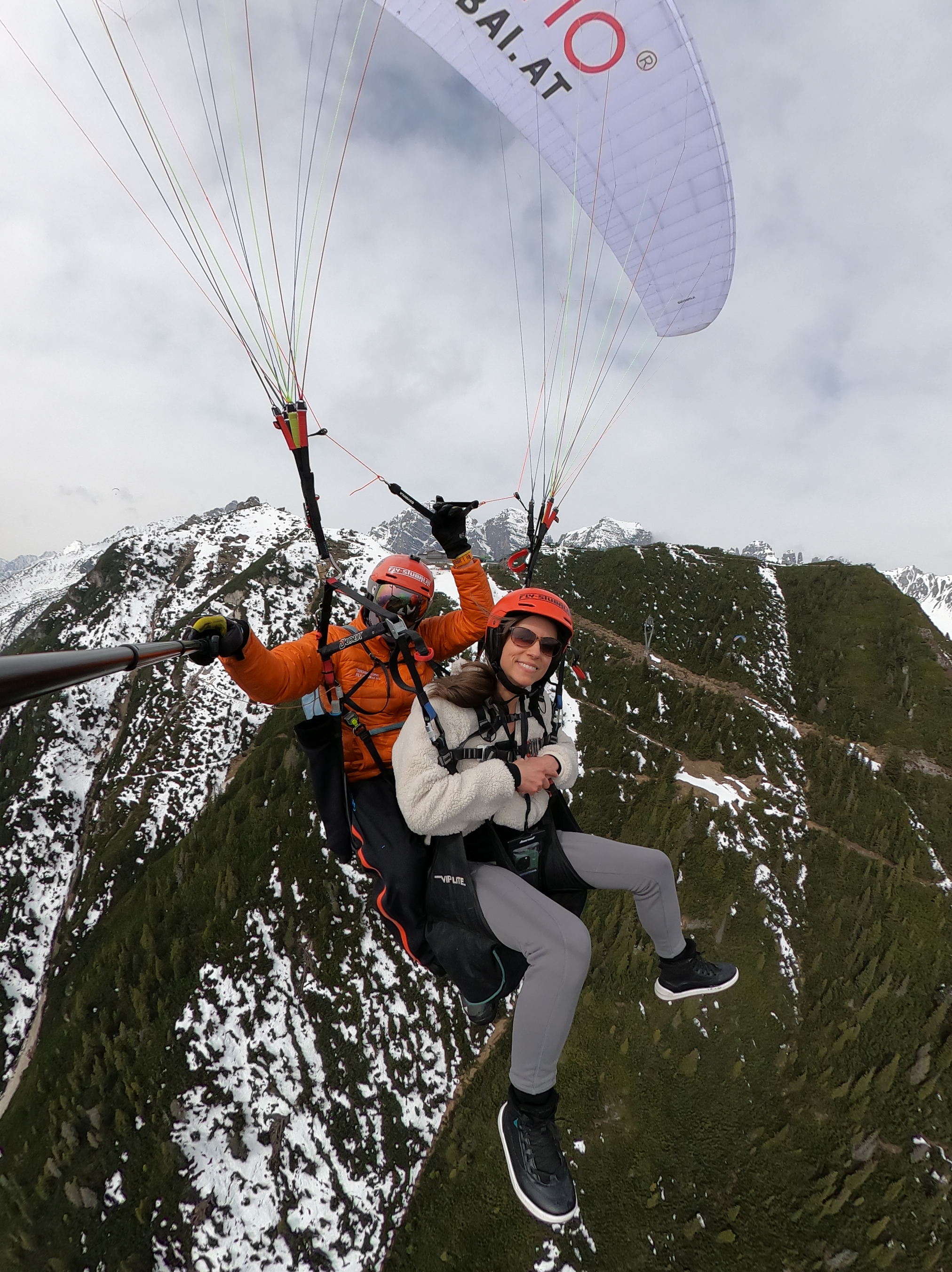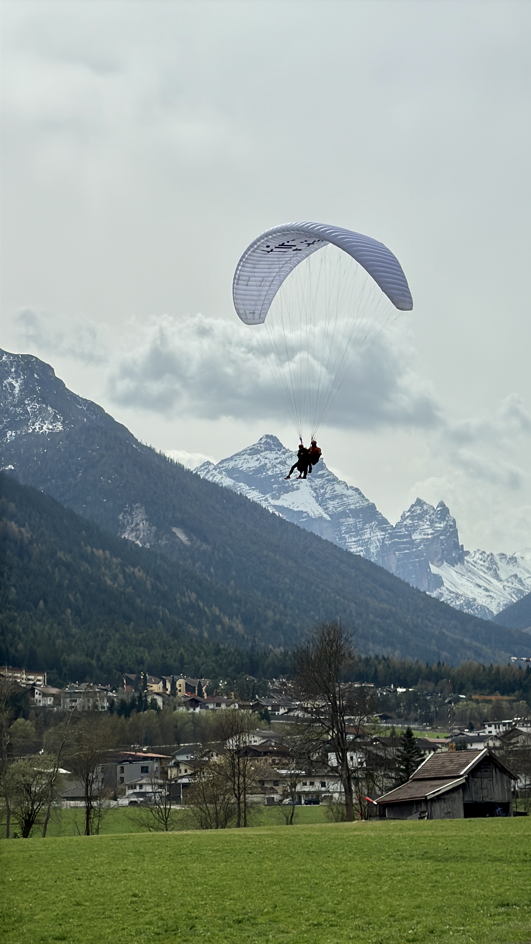 Nothing could have prepared me for how truly incredible this experience would be. The views of floating in and around mountain peaks on every side and a small village down below, the perfect silence except for the air rushing by, I couldn’t stop smiling and gaping at the extreme beauty at every turn. Shoutout to Amy for telling us to bring a phone strap so we could take our own pictures and videos! The pilot said the thermals were ideal for flying so I soon found myself higher that we began with Michael down below.