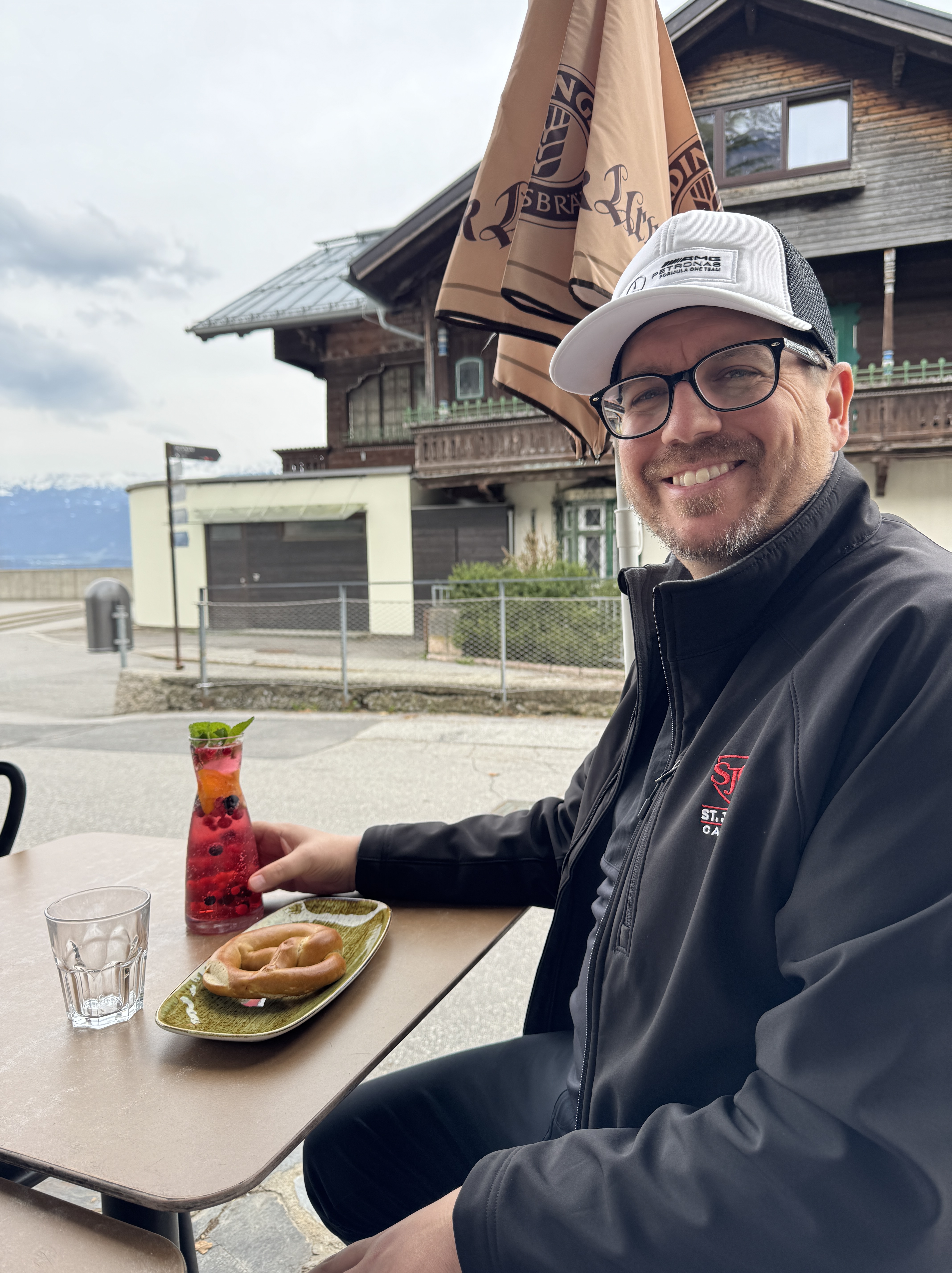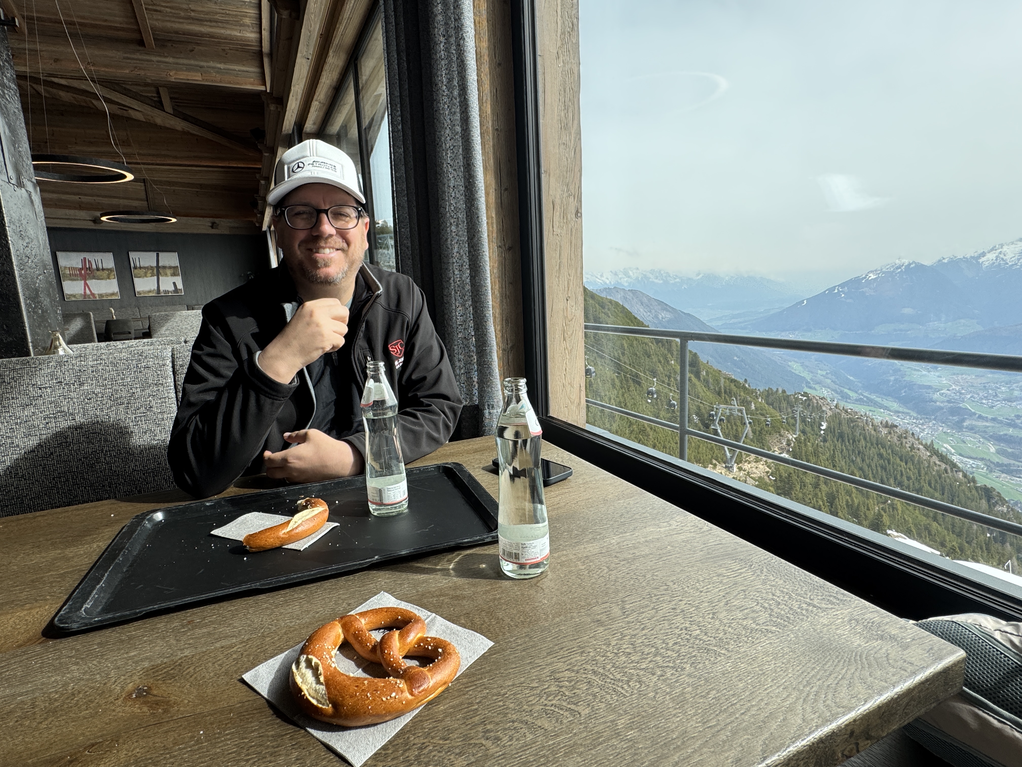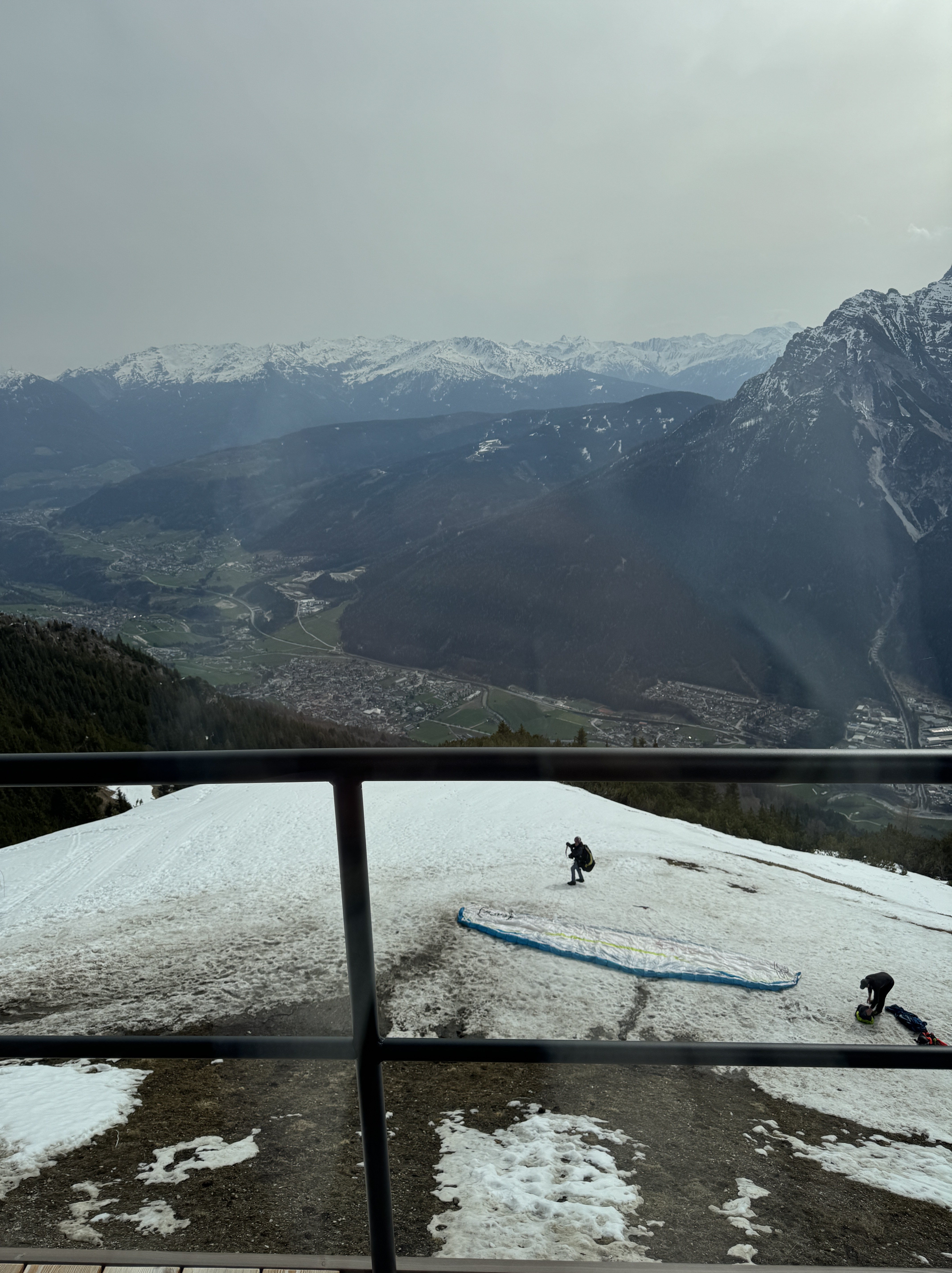 At the top, we had about 45 minutes to spare. So, we went into the Panorama Bar, got a soft pretzel for breakfast (cuz Austria) and sat to watch other paragliders prepare and take off. It was a gorgeous day with only a few clouds and little to no wind at the top. We truly could have spent all day up there with a good book and a cup of tea.