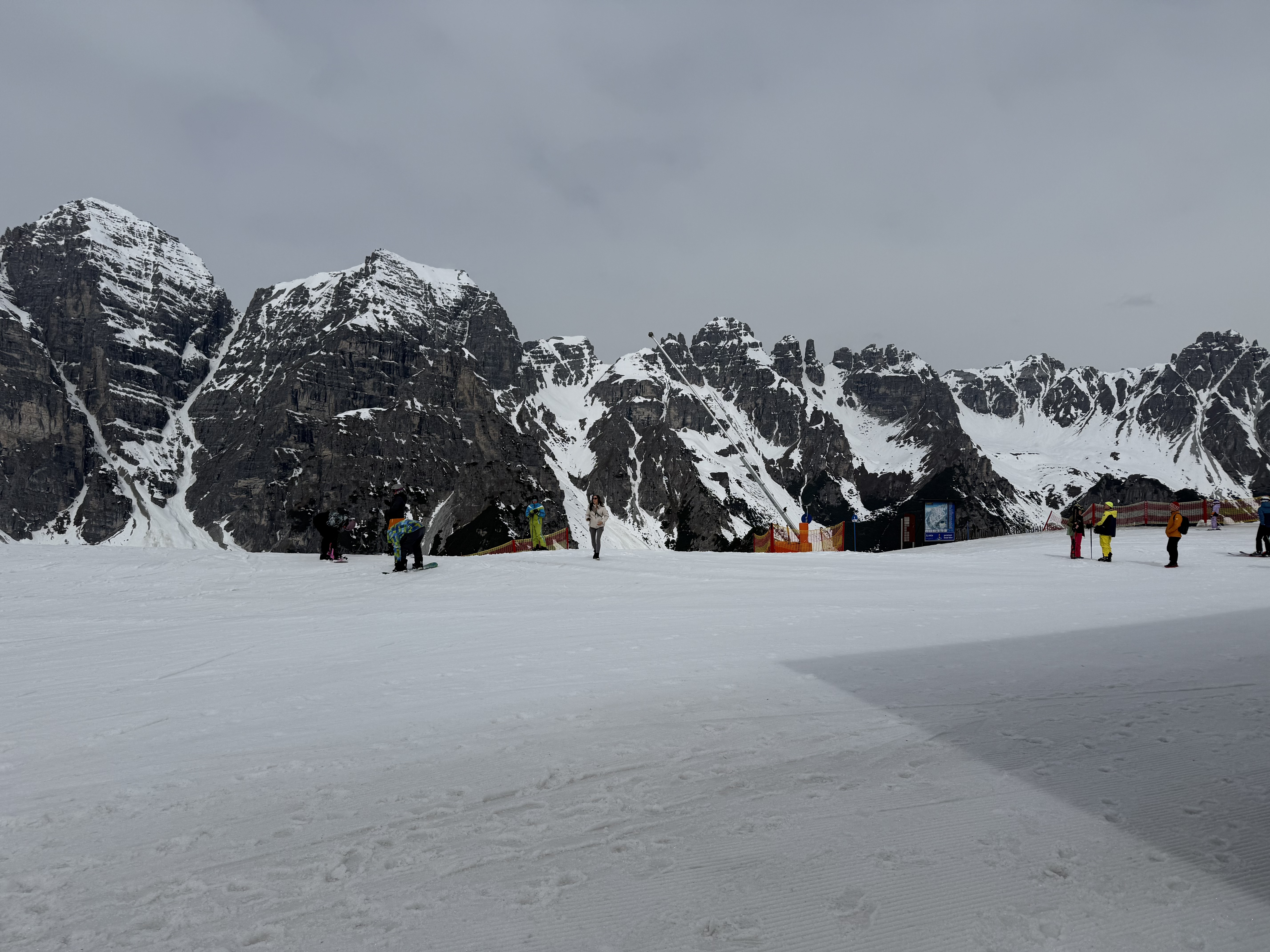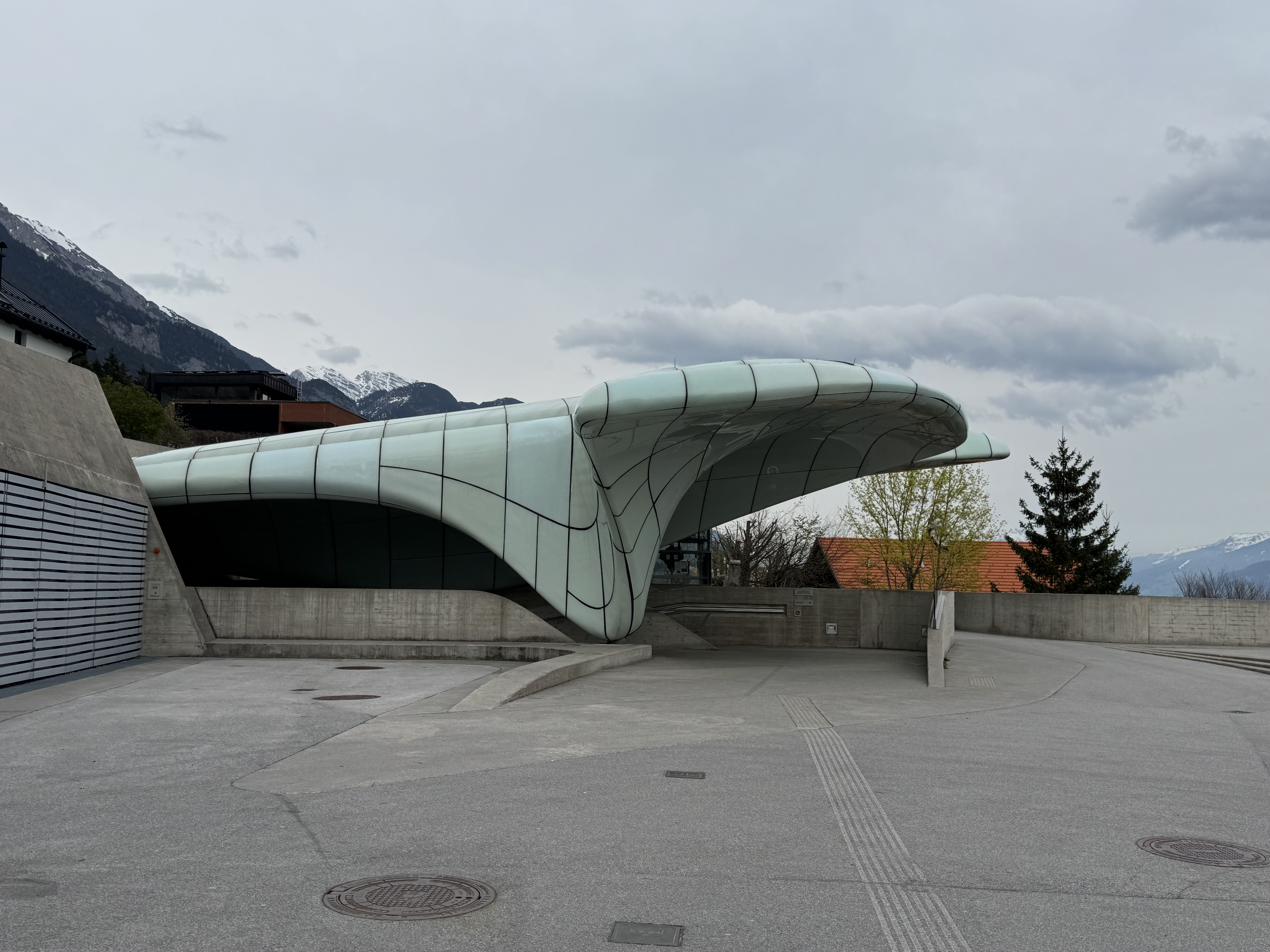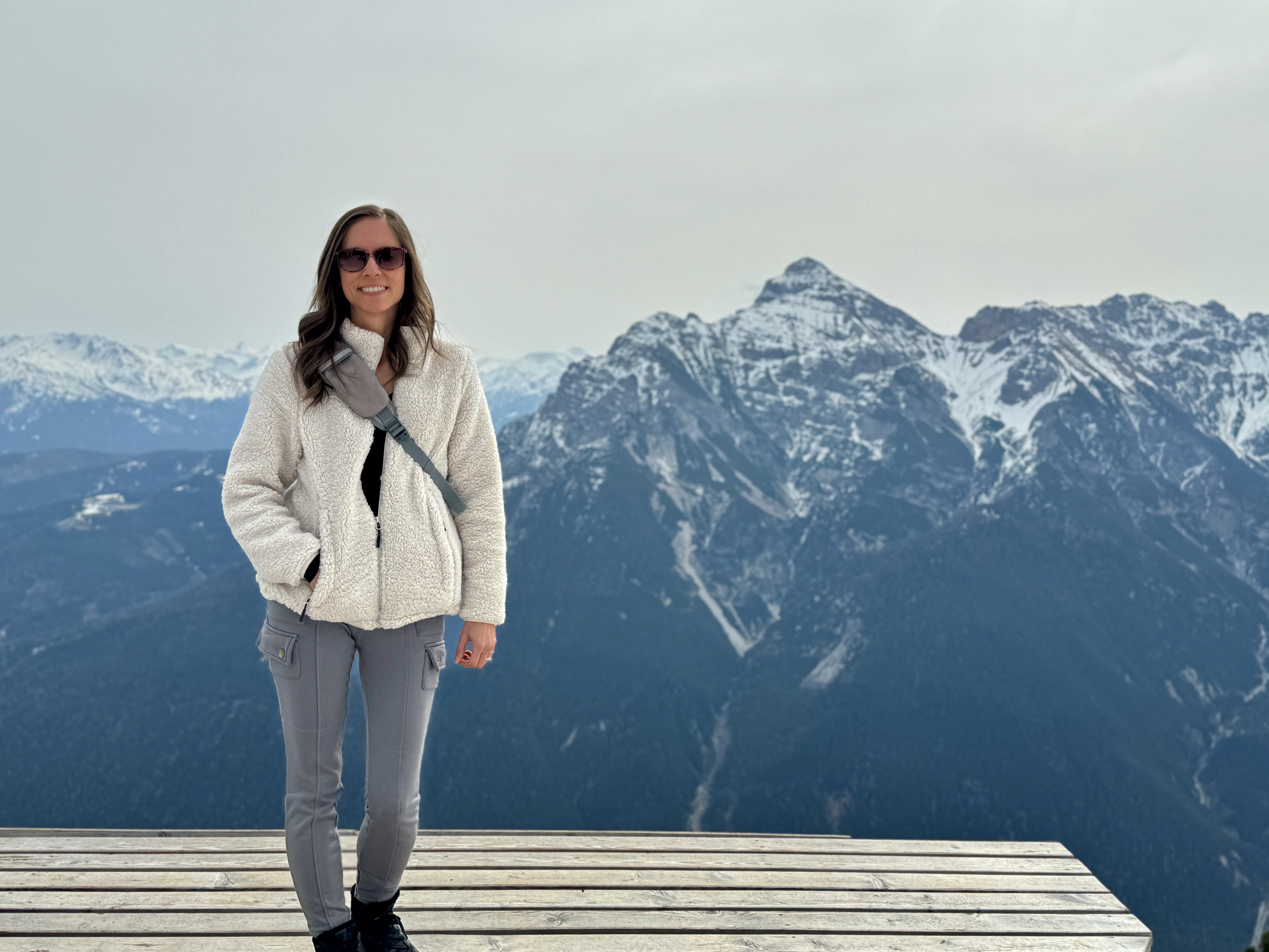 Now that we were a bit behind schedule, we took a taxi to the bottom station for the Innsbruck cable car. We bought tickets and started our trek up. This journey starts with a tram and then shifts to a huge cable car the higher up you get. The Top Of Innsbruck closed the earliest so we headed straight to the top and then paused at the stations on the way down. As we approached the top, we could hear the wind whistling wildly and could see the snowy patches turn to solid white. We stepped out at Hafelekar to be smacked in the face with winter cold. Hatless, gloveless, fall coats only, and Michael’s previously mentioned footwear, we were happy to snap a few pics and then jump right back on the cable car.
