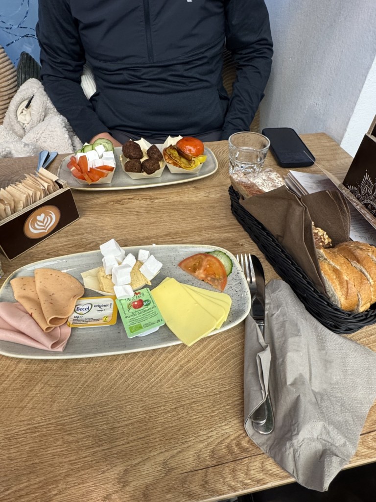 We then strolled (oh, glorious feet) to a place that served a vegan version of authentic Austrian breakfast. It was deliver to us like so: