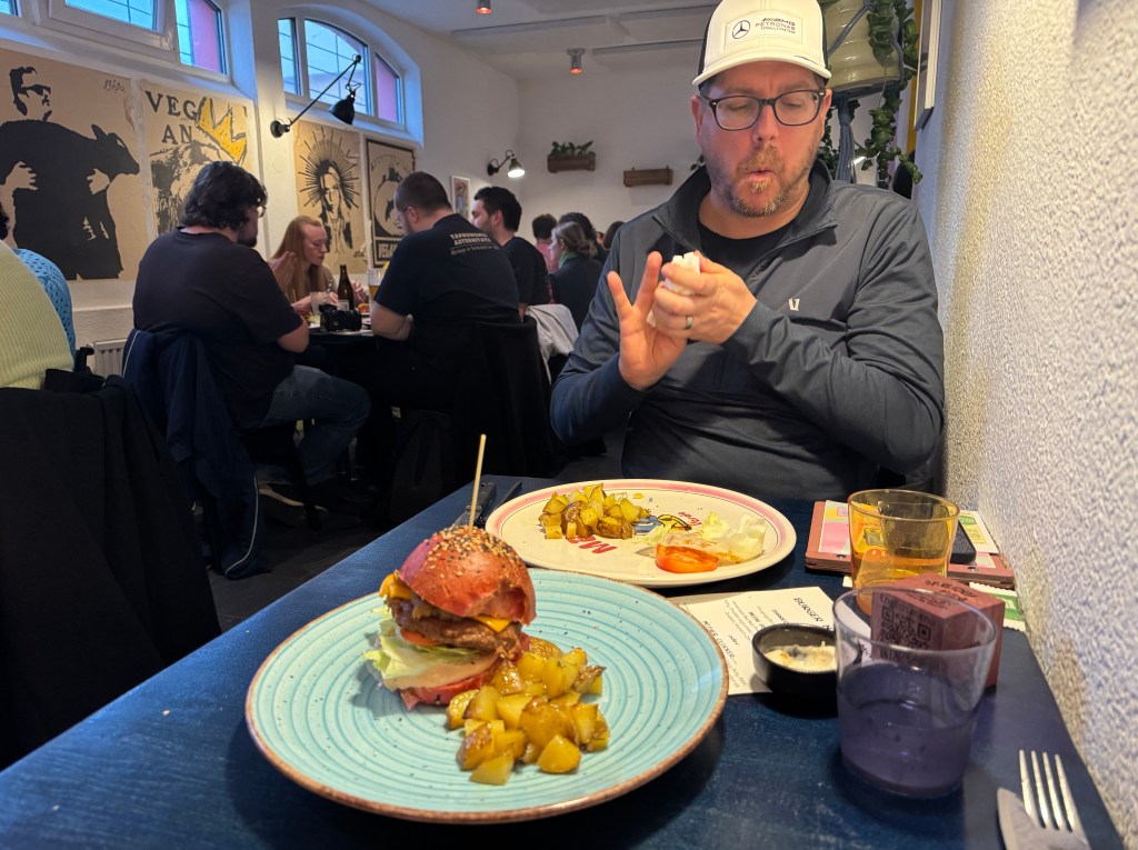 Now we could sit back and enjoy and people watch (best part of travel, right?). Hmm…interesting…the room is full of friend groups, no couples, and…no one over the age of 22 (except for these awesome 40 year olds in the corner). Why yes, this is a night supported by a group at the local university for students and Sawyers! We ate our burgers, laughing at the choices that brought us here, when one more surprised approached us. A student was walking around passing out papers and pencils. Not only was this a student event, it was also trivia night (in German of course)<<insert palm to face>>. The waitress, having pity on us, offered to bring us our dessert early so we could escape.