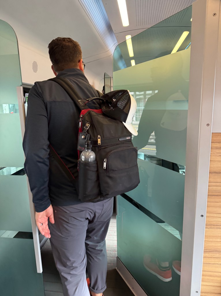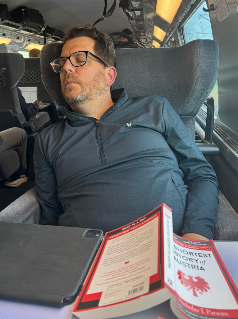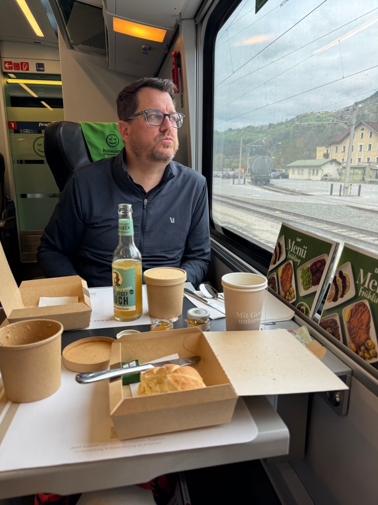 About 2.5 hours into our trip, right when we were nice and settled, an announcement came over the loud speaker, first in German but then in English (thank goodness). Everyone was to get off at the next stop because of an issue with the train. Michael’s quick work online made it look like we would have to hop on and off 2 more trains in the remaining hour. Fortunately, we pulled into the station and there was an identical train on the parallel track waiting for us. Our whole car transported from one place to the other with only a few minutes lost.