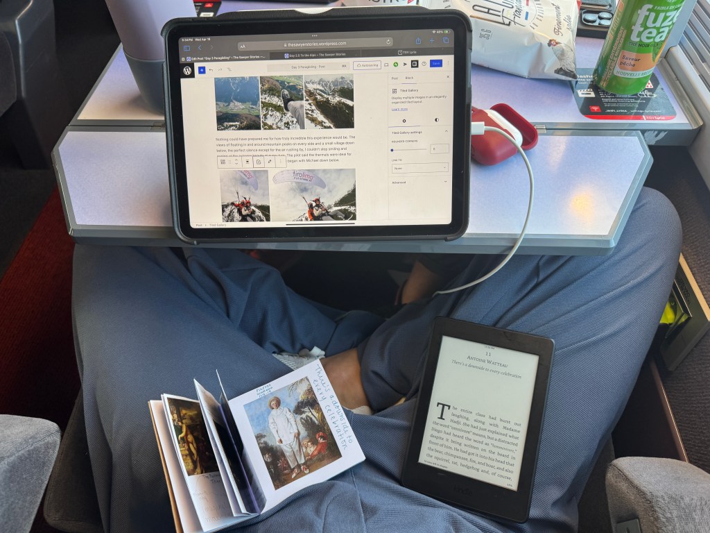 We learned on our last trip that how you get there is half the fun. Today we embraced that idea by traveling to Paris by train. Our first train leg left in the morning on the OBB and headed through the Alps to Zurich. We hopped on the train excited for our facing seats with a table so we could play cards…or so we thought. Turns out our tickets were in the quiet car. Out of respect, we decided on silently reading, writing, and napping. The Austrian man across from us, however, made no such decision. He boisterously continued his conversation in German with his colleague for 2 straight hours. We may have all considered applauding when he departed.