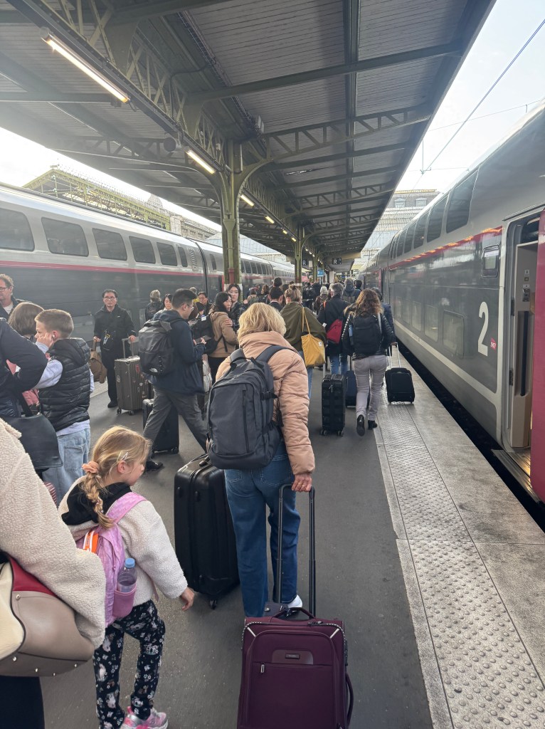 Back at the station, we found our track on the giant departure board and made our way there. As we stretched and waited in anticipation for our train to arrive, my genius husband remembered….oh yeah, we have luggage! Pause for a moment to think with me what would have happened had we left our belongings in Switzerland as our bodies slowly made their way to France. Yeah, I’m glad that’s not a story I get to write.