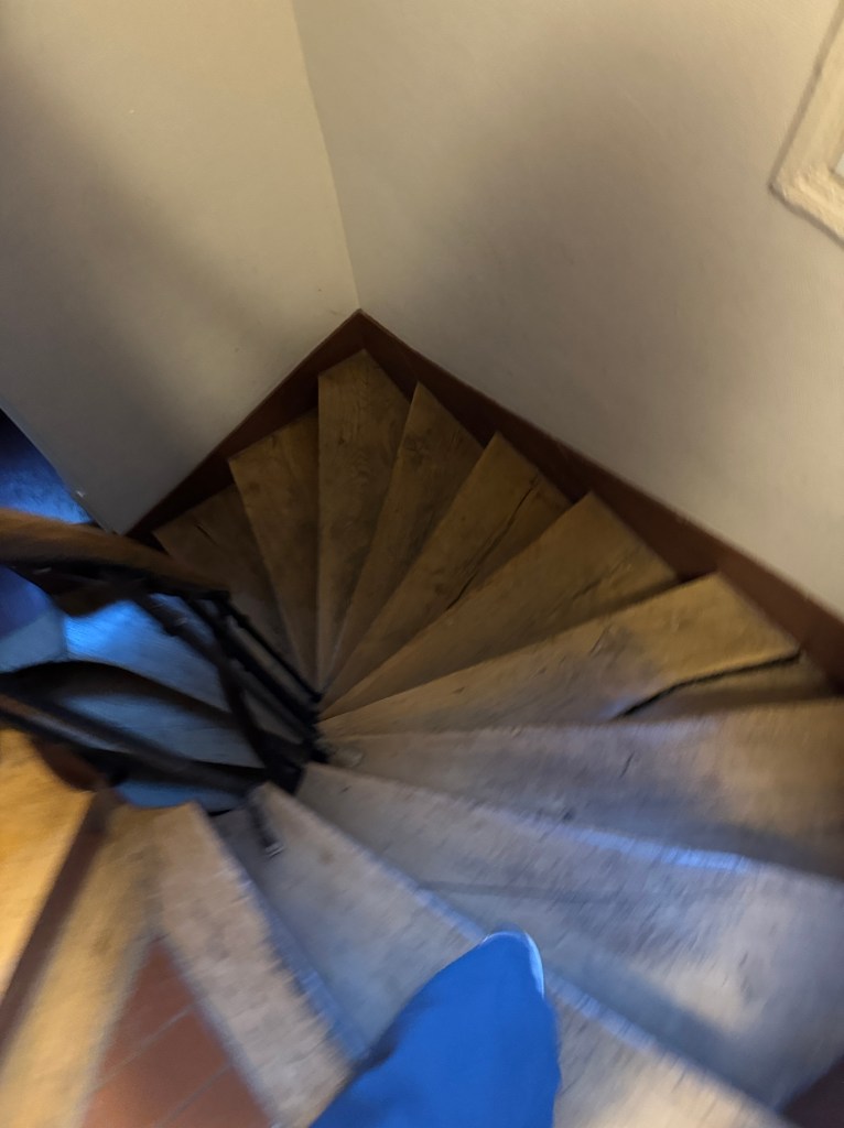 We found the blue door nestled between restaurants and walked in. Wait, what did the hosts directions say to do next? Oh yes, walk allllll the way up the spiral stairs to door the very top. Our home for the rest of the week was waiting there. Knowing amazing views awaited us once again held as motivation as we traversed the 73 steps carrying our luggage. The apartment did not disappoint.