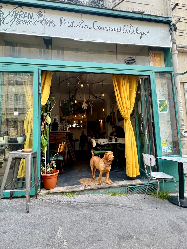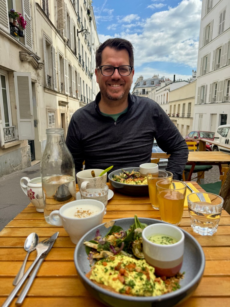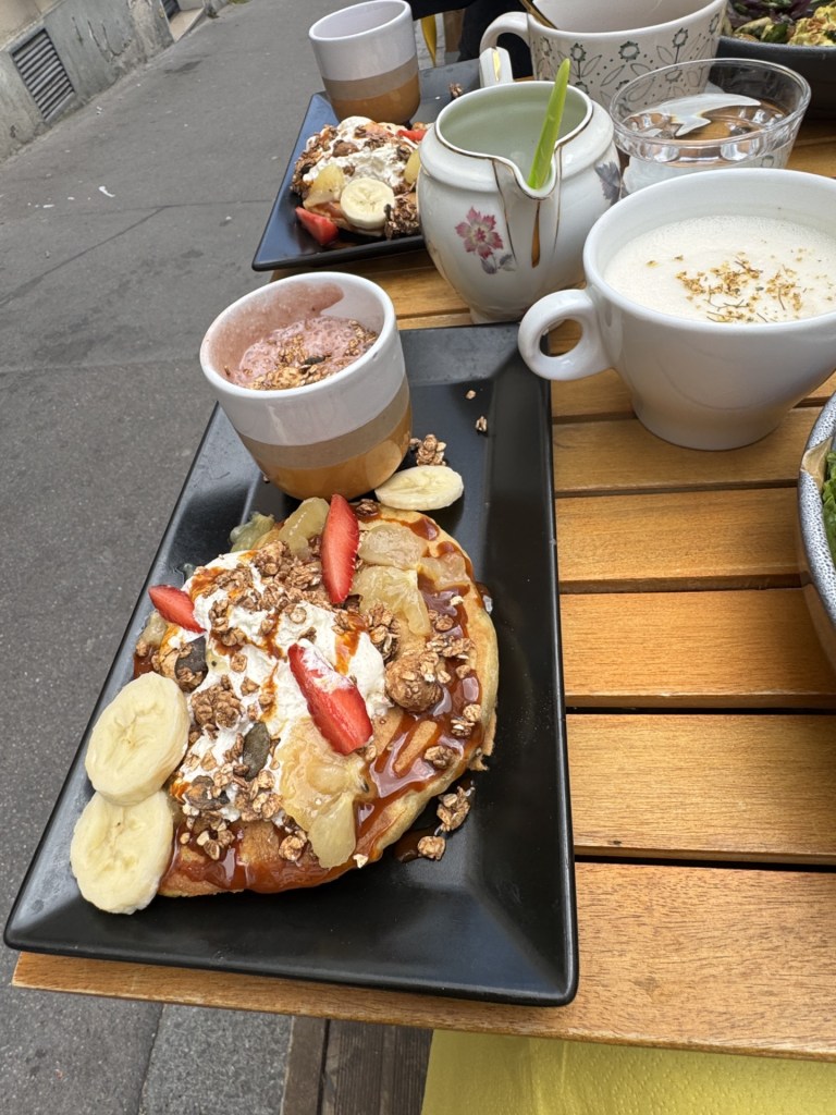 We got our bearings and climbed our way through the market and up a big hill to find the one vegan restaurant we had successfully found on our online searches. When we walked up we were greeted with the best news ever, “We are only serving brunch right now.” Oh, how we love breakfast food. She brought over the handwritten sandwich board with the fixed brunch menu including a savory pancake course and a sweet pancake course (as well as the best chai latte I’ve ever had). This was the one meal we fully embraced the French vibe of savoring and lingering. Well, it felt like we stayed a long time at least. We were still outlasted by the French duo that was there before us.