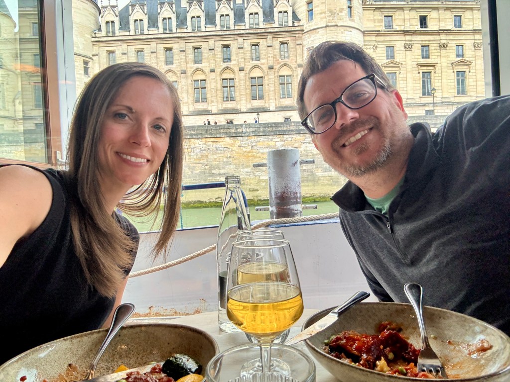 Even though our 20th anniversary isn’t until July, this was our celebratory dinner. We clinked to 20 amazing years together and many, many more to come. We enjoyed the views outside our window as we slowly sailed along the Seine.
